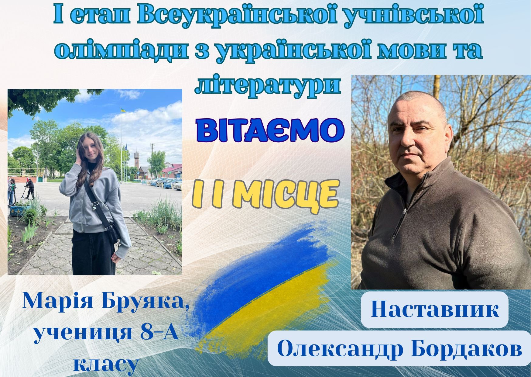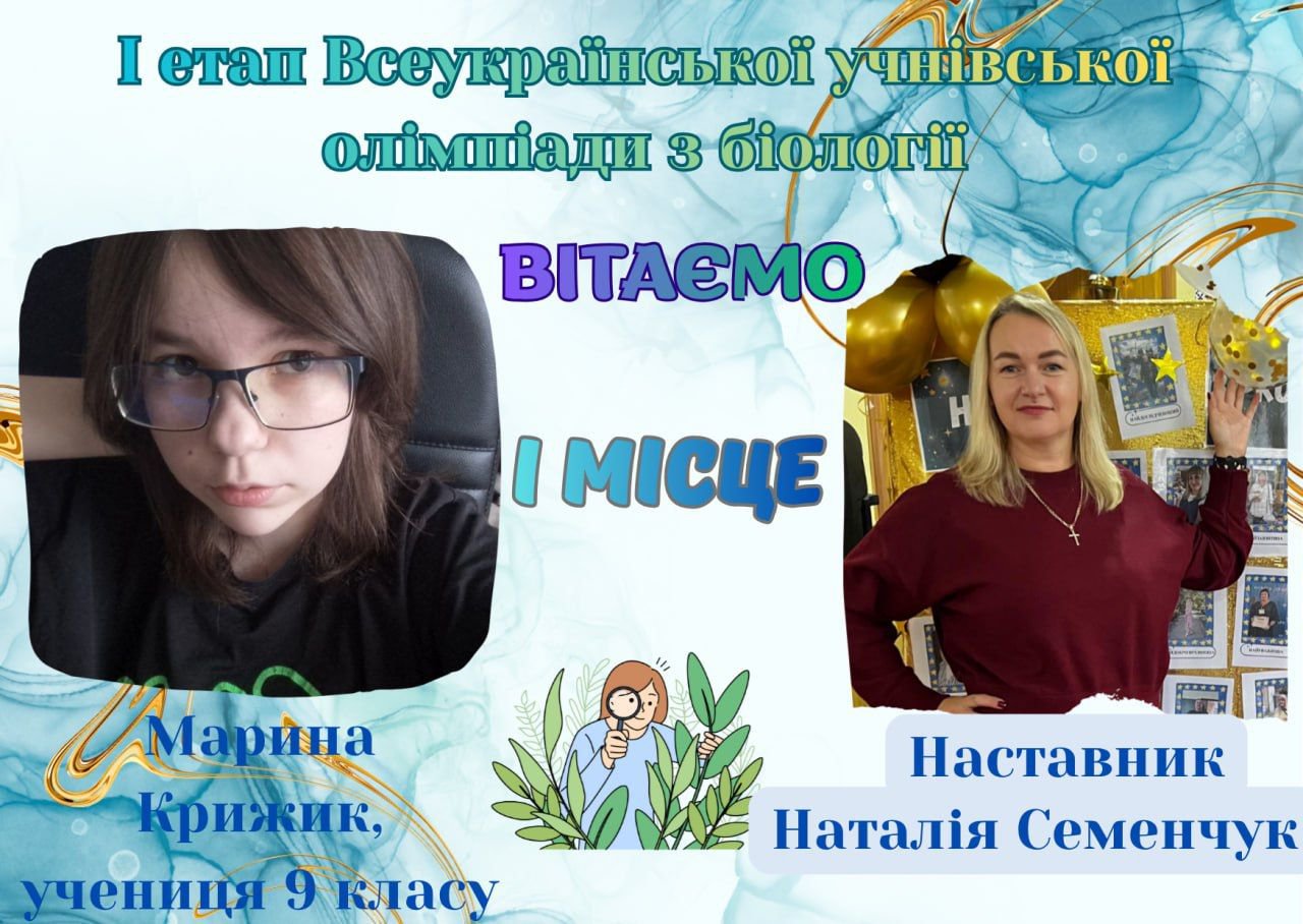 Вітаємо ученицю 9 класу Вікторію ВОРОБЕЙ, за здобуте ІІІ місце в І етапі Всеукраїнської учнівської олімпіади з англійської мови. Щира подяка наставнику, вчителю англійської мови Світлані ВОРОБЕЙ, за плідну співпрацю та результативність. Бажаємо подальших успіхів та щиро віримо в ПЕРЕМОГУ!
